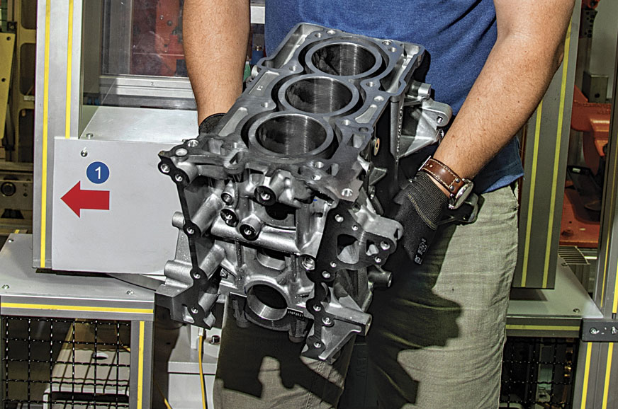 This engine is a distant relation of the EcoBoost, and since it’s a three-pot, I lift the block, just to see how heavy it is. It is 500cc larger and so is a bit bigger, but yeah, you could take this 12 or 13kg lump of aluminum as hand luggage, just as a Ford engineer did in the US with the EcoBoost block.