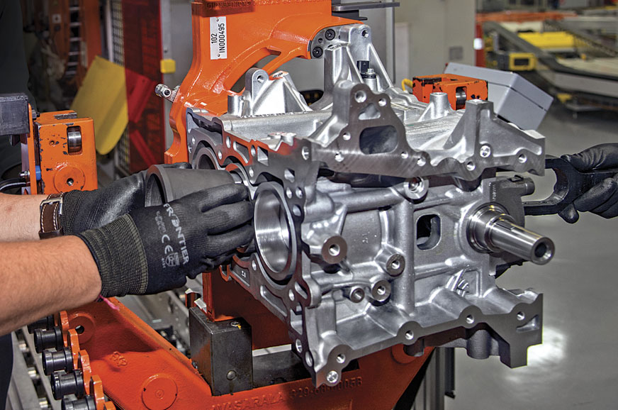 Soon after the block is picked up by a robot, the cylinder bores are lubricated, and we catch ◊ ∆ up with the bottom half of the engine further down the line, where I have to manually slot the pistons in. Like many modern engines, the Dragon has a crank offset by 10mm to help reduce piston slap and friction. And when we stand this unusually tall engine up I can sort of tell. And what’s fascinating to see is that this engine also has extra reinforcement in the shape of a ‘ladder frame’ that helps reduce noise vibration and harshness. And that’s what goes on next.