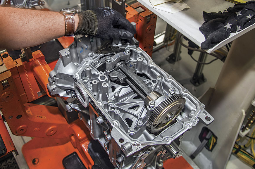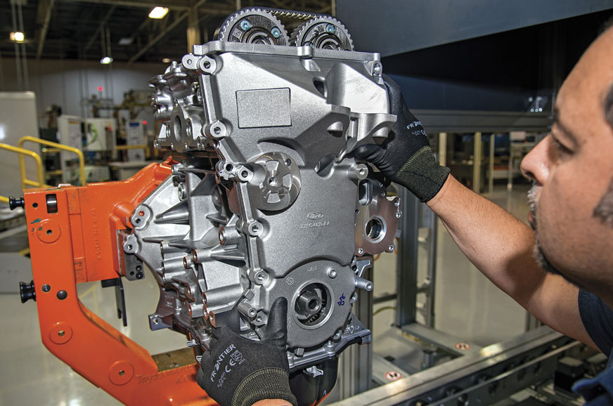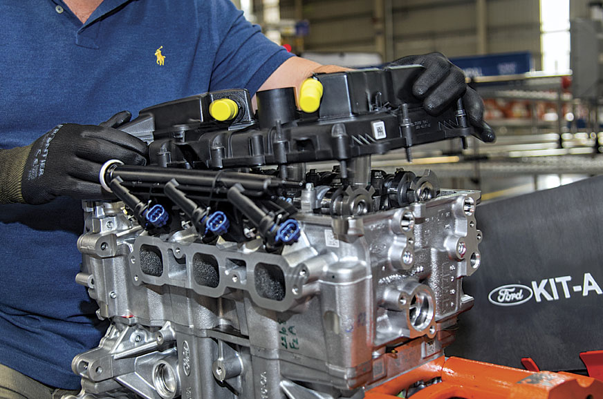 Then comes the most difficult part – linking all the moving parts together. Still, this belt is easier to thread around the various teeth than most chain-drive systems. And though Ford’s minders help, it slots in after only a bit of push and pull. “What’s important to remember is that both cams can be phased by the ECU, and this means the engine can be optimsed for both low-and high-speed operations,” says the man from Ford. But I’m more concerned by the quality of my assembly.