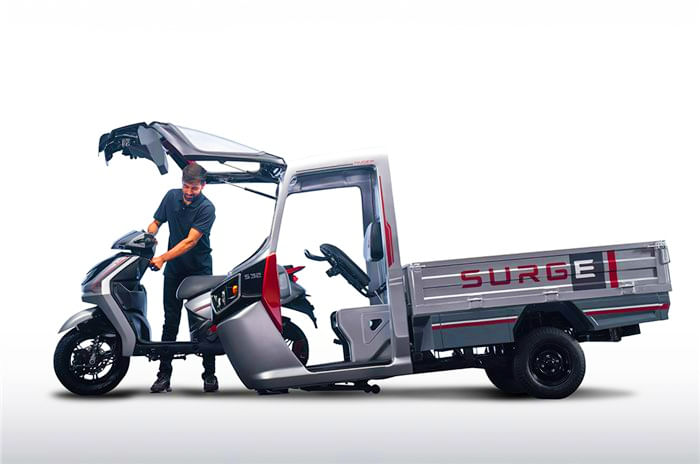 Surge is a startup that is wholly owned by Hero MotoCorp (it is part of HeroHatch, the company's incubation centre), and it has spent the last few years working on a modular EV platform that it calls the S32. What makes it unique is that it’s designed to quickly and conveniently convert between a two-wheeler and a three-wheeler. Essentially, it comprises a rickshaw without a front wheel, into which an e-scooter slots and also acts as the front wheel. In this form, the rear wheel of the e-scooter is off the ground and rests on the rickshaw platform.