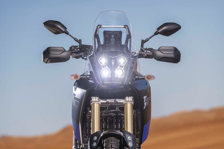 The Tenere 700 also features a rally-style fairing and windscreen that, Yamaha says, has been designed to give you protection from the wind while maintaining the narrow and lightweight nature of the motorcycle. The front of the bike also features four LED headlights that are derived from the Japanese manufacturer’s latest rally bikes and the T7 concept.