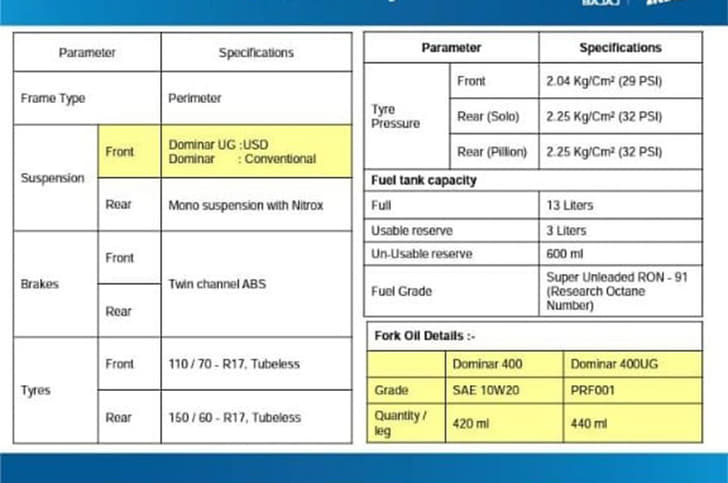 The 2019 Dominar was also seen testing with an updated instrument cluster and new exhaust. The leaked specification sheet confirms that the new bike will use its secondary tank-mounted unit to display gear position, odometer and time; while its earlier functions have been taken up by the handlebar-mounted primary display that now conveys info in text. Meanwhile, the exhaust sports a twin-exit muffler and has a much deeper rumble to it.