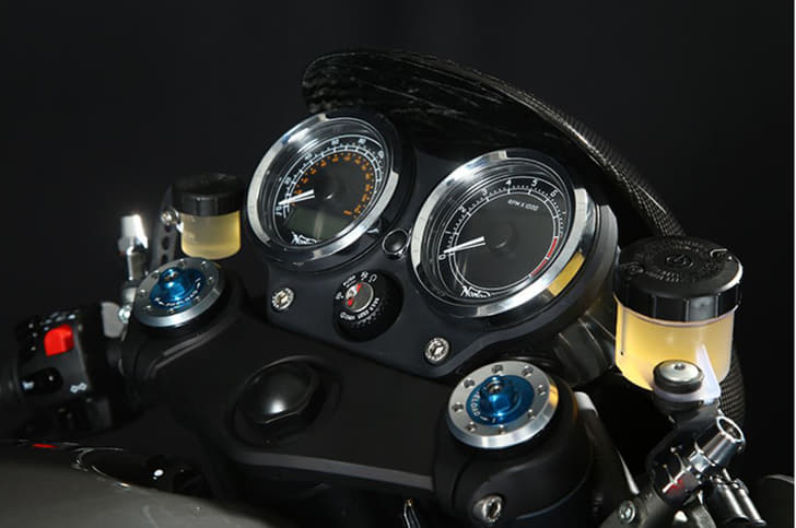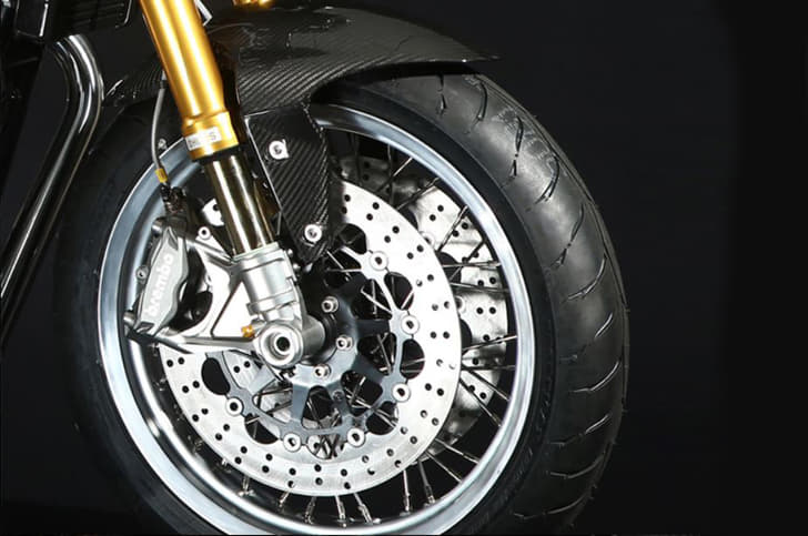 The 752S uses a new steel trellis frame and gets fat 50mm forks. These give the bike a tough, streetfighter look, alongside the oval LED headlamp. Bodywork is minimal, with a big fuel tank and a slim tail section. A fat 180 section rear tyre only adds to the muscular look. Braking is handled by twin 320mm discs bitten by four-pot calipers. The brakes have their work cut out given this bike's hefty 220kg dry weight.