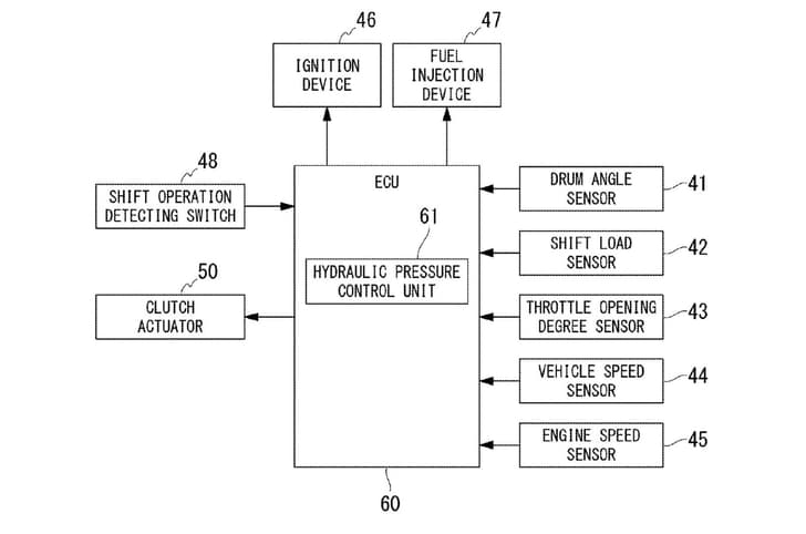 Patent drawings show a conventional handlebar-mounted clutch lever, whose position is electronically monitored by a position sensor. This reading is then sent to a hydraulic control unit, which also receives a whole bunch of other information including vehicle speed, engine rpm and throttle opening. On the basis of all this data, the control unit actuates the clutch.