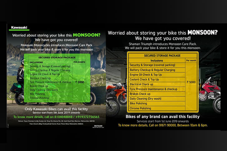 Triumph, Kawasaki Mumbai dealers offering monsoon storage for Rs 5,000