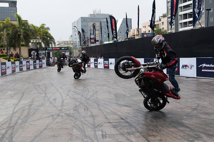 Five stunt teams, all on Apache RTR 200 4Vs, performed for six hours straight.