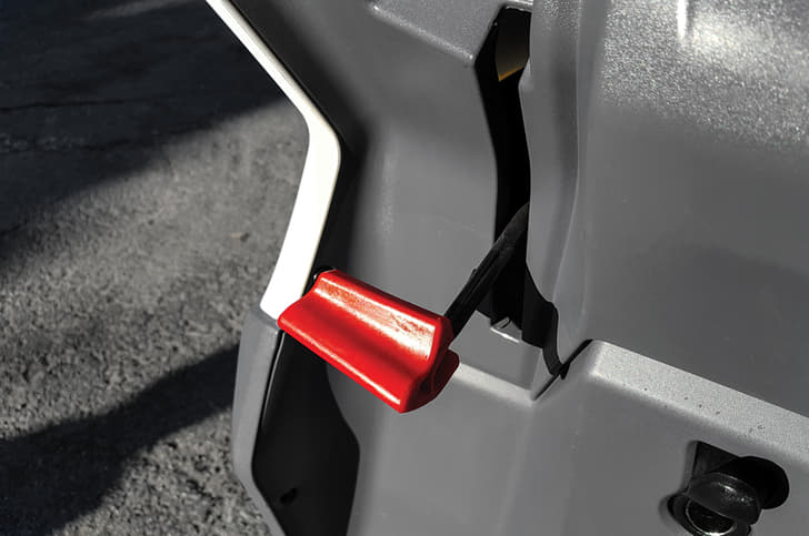 Fundamental to his vision of a small-displacement scooter was affordability with regards to acquisition as well as maintenance. Complex electronics and a sensor-heavy system was instantly out of the question, then. So Tom set about trying to devise a multi-arm-style tilting unit with 14-inch wheels mounted at either end. He also devised a mechanism called the Tilt Lock and Brake System (TiLaBS), which works using a series of mechanical linkages. The rider can engage the three-stage TiLaBS using a landing-gear-style downward-movement lever mounted on the apron, with the second and third modes offering to tilt lock (useful at crawling speeds) and engage parking brakes, respectively.