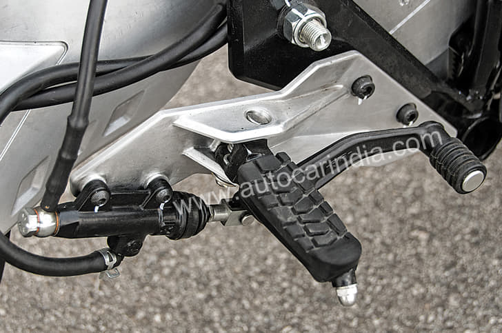The instrument console looks neatly finished, though, with the plastic surround (what? Not metal?!) keeping the rider’s view uncluttered. Instrumentation isn’t over-the-top but provides enough, with an analogue tachometer and a rectangular screen with a speedometer, odometer, two trip meters, a fuel level indicator, a clock, gear-position indicator and engine temperature being neatly displayed. Could have been fancier, I’d say, but nothing to strongly dislike for sure. What doesn't feel very premium is that the speedo takes a while to settle on zero if you slow to a halt in a hurry. The switchgear, also isn’t quite premium. It works and is laid-out in an uncomplicated manner, but in an age when sub-200cc motorcycles offer even back-lit switches, a Rs 5 lakh motorcycle should not make do with dated-looking stuff. The ABS switch is mounted on the mirror stalk mount and looks like an afterthought but, on the good side, everything does fall to your opposable thumbs quite easily. The front brake lever is an adjustable unit although I see nobody being able to use it on setting 1 or 2. But that’s nitpicking, so let’s move on.