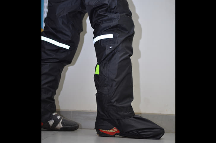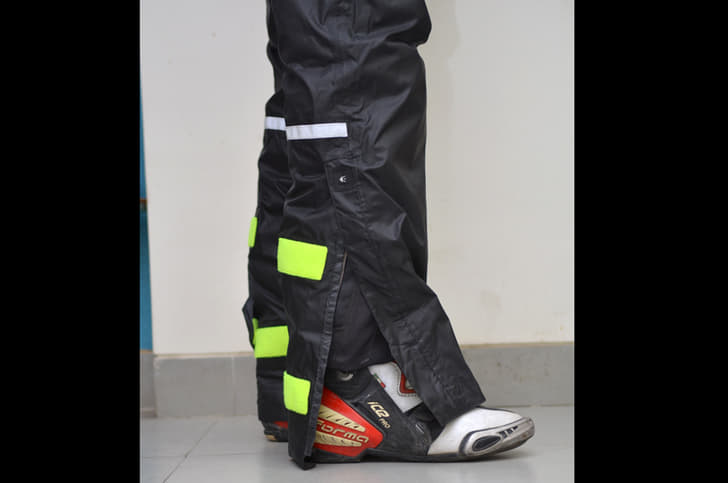 Visually, the B’TWIN rain pants look just like any other rain pants in the price range, but there are some aspects that make it greater value for money. For starters, there’s the ease of slipping them on over your riding gear. From the calf downwards, the pant has a split that is held together by two bright green Velcro straps, instead of a zipper like you might usually find on other rain pants. This helps slip them over riding boots and I even managed to do so over a pair of bulky ADV boots.