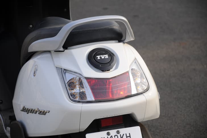 The TVS Jupiter’s fuel-filler lid is located at the tail end of the scooter, and doesn’t require the rider to dismount for a tank-up. Storage space under the seat remains about the same as on any rival scooter. Other nice touches come in the form of an easy to deploy main-stand, catchy looking 3D emblems, an alloy grab-bar for the pillion and 5-spoke alloy wheels that are black finished. The Jupiter’s rectangular taillight is flanked by clear lens turn signal indicators which look smart.