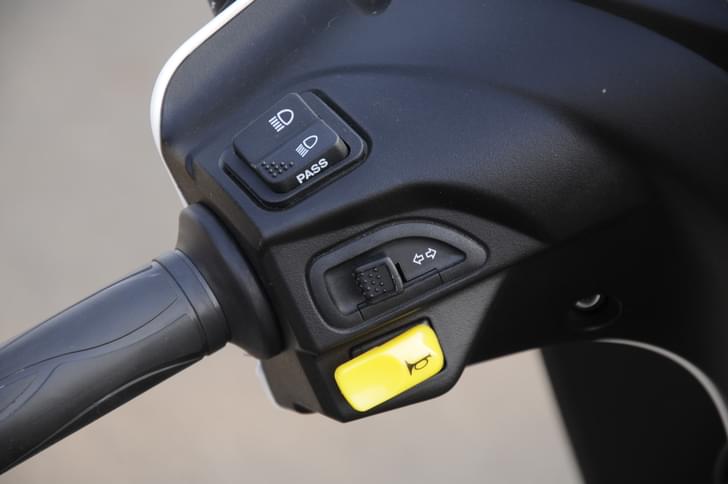 Viewed from the front, the Jupiter front apron is home to a set of clear lens turn signal indicators, as well as a central air vent. Above is a bright headlight that works well at night, and sits surrounded by a pair of pilot lamps. Bold, analogue instruments offer the rider a speedometer, fuel-gauge, economy or power riding mode indication and low fuel warning. There’s really good attention-to-detail, as seen everywhere including the Jupiter switchgear. The switches get dimpled texture that add good feel. The switchgear includes a nicely integrated pass-light flasher which proved handy when riding in city, a feature not regularly found on scooters here.