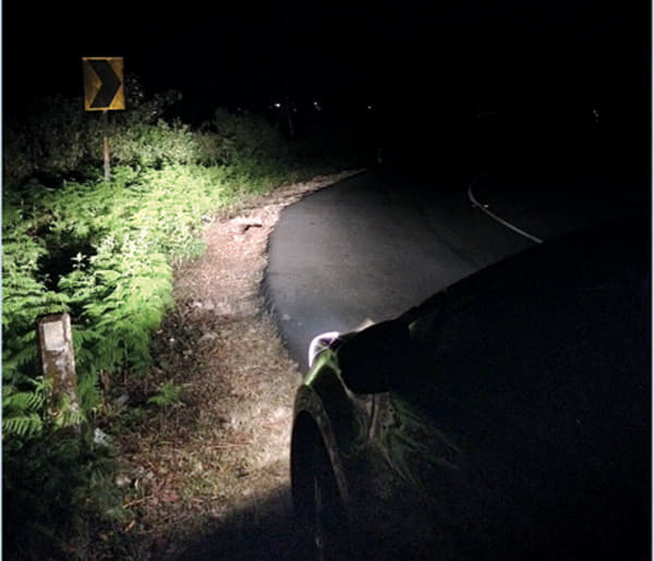 The Elantra's low beam doesn’t have enough spread or throw. You need to keep switching to high beam.