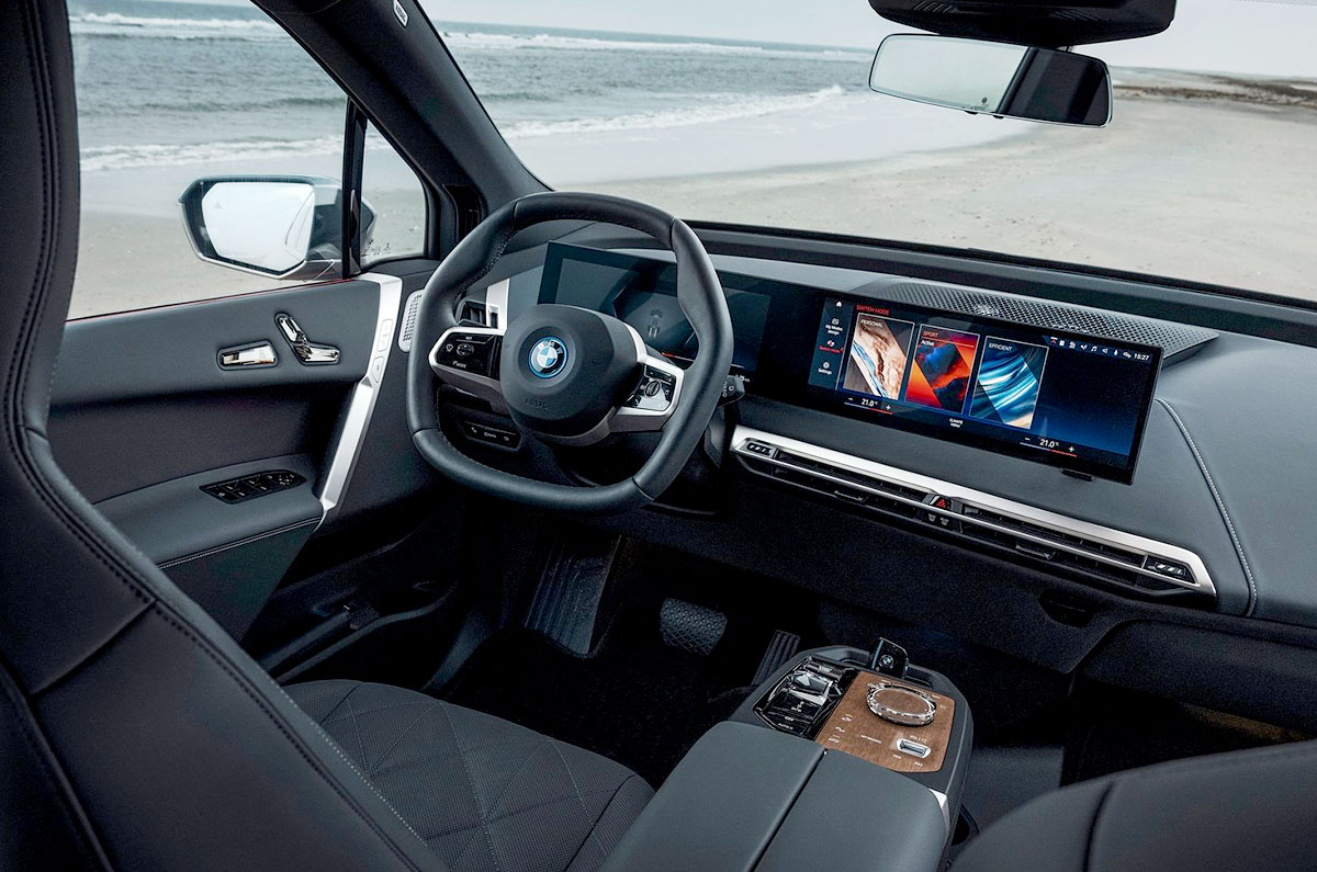 Inside, it has the same lightly curved display as the other iX models, running BMW’s eighth-generation iDrive operating system, with a focus on touch functions and voice communication. With no centre console, the controls, including the iDrive rotary controller, are set within the forward section of a high-mounted armrest.