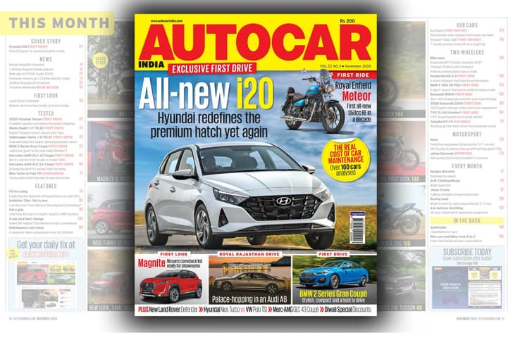 The November 2020 issue of Autocar India is out now, and headlining our latest issueisour India exclusive review of the new Hyundai i20. To go with it, we bring you a much-awaited first ride report of the Royal Enfield Meteor 350.But that’s not all – we’ve also packed in a detailed first look of the Nissan Magnite compact SUV, and our comprehensive car maintenance cost study. Also part of this issue are first drives of the Hyundai Tucson facelift, Skoda Rapid 1.0 TSI AT, updated Mercedes-AMG GLC 43 Coupe and the new Mercedes-AMG GLE 53 Coupe. Plus, there’s a face-off between the Hyundai Grand i10 Nios Turbo and Volkswagen Polo 1.0 TSI,as well as a special drive involving the new Mahindra Thar and its predecessor.To go with these, we’ve packed in first rides of the Honda Hornet 2.0, BMW F 900 XR, 2020 Kawasaki Z650+ more juicy news from the industry andfeatures you’ll enjoy reading. Here are the highlights: