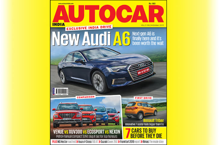 In our October 2019 issue, we bring you an India exclusive review of the brand-new Audi A6, which is here after a long wait. Plus, we have drives of the Renault Triber, Isuzu V-Cross 1.9D AT and a comprehensive road test of the MG Hector. Also in this issue is a comparison involving petrol-manual versions of the Hyundai Venue, Tata Nexon, Mahindra XUV300 and Ford EcoSport and a list of 7 cars to buy before they die, to go with our reviews of the Suzuki Gixxer 250, MV Agusta Turismo Veloce, Bajaj Pulsar 125 Neon, Indian FTR 1200 S + more juicy news from the industry and features you’ll enjoy reading. Here are the highlights: