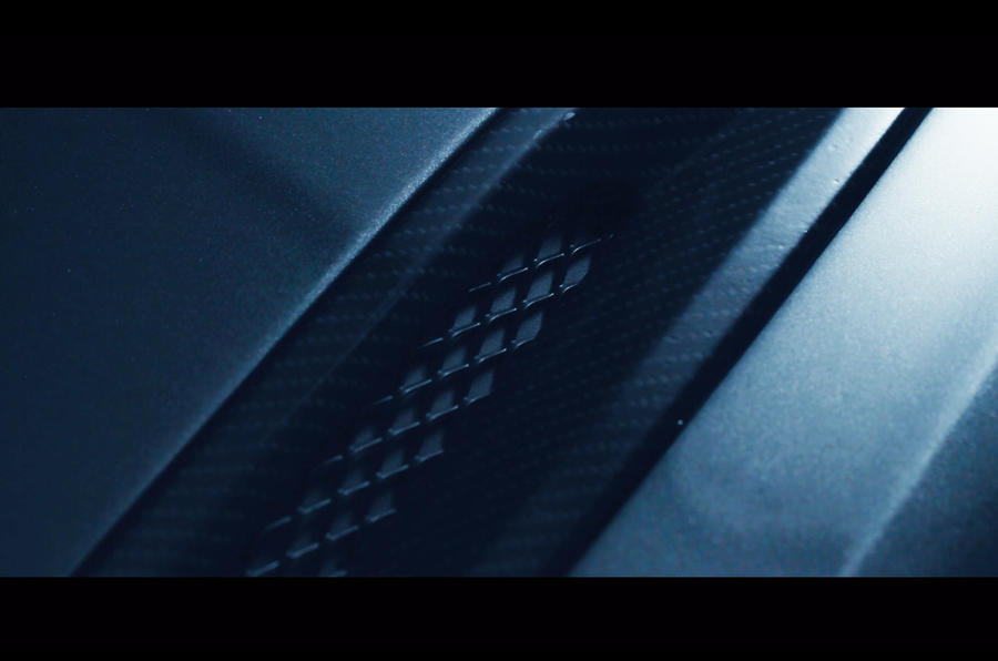 The three detail shots show a carbonfibre vent, large alloy wheels with red brake callipers and large disc brakes, and a chunky carbonfibre rear wing, further suggesting the hardcore approach to the car.