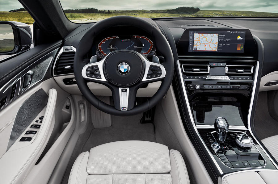 Predictably, the new 8-series convertible mirrors the look of the new 8-series coupé, with a bold front end and muscular lines. Its multi-layer fabric roof, which comes in a choice of either a standard black or optional anthracite colour, opens in 15sec at the touch of a button at speeds up to 50kph; it automatically stows beneath a tonneau cover trimmed with the same slush moulded plastic as the dashboard and door trims at the rear of the 2+2 cabin. BMW claims 350 litres of boot capacity with the roof in place, which reduces when it is stowed. To accommodate lengthy items, the rear seats split and fold in a 50:50 form to free up greater load space.