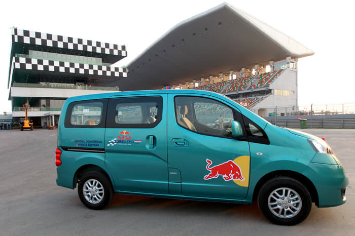 Since Nissan is the official light commercial vehicle supplier for the Red Bull Racing F1 team, the company provided ten all-new Evalia vehicles to support the team’s race operations during the 2012 Indian GP. Outfitted with Red Bull Racing team logos, the Nissan Evalias transported staff and equipment for Red Bull Racing.
