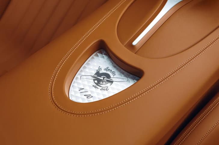 The aviation theme is carried over to the interior, where the door panels have been decorated with a "hand-sketched" depiction of a Nieuport 17 aeroplane racing against the legendary Type 13 racer - the first model to bear the Bugatti badge.