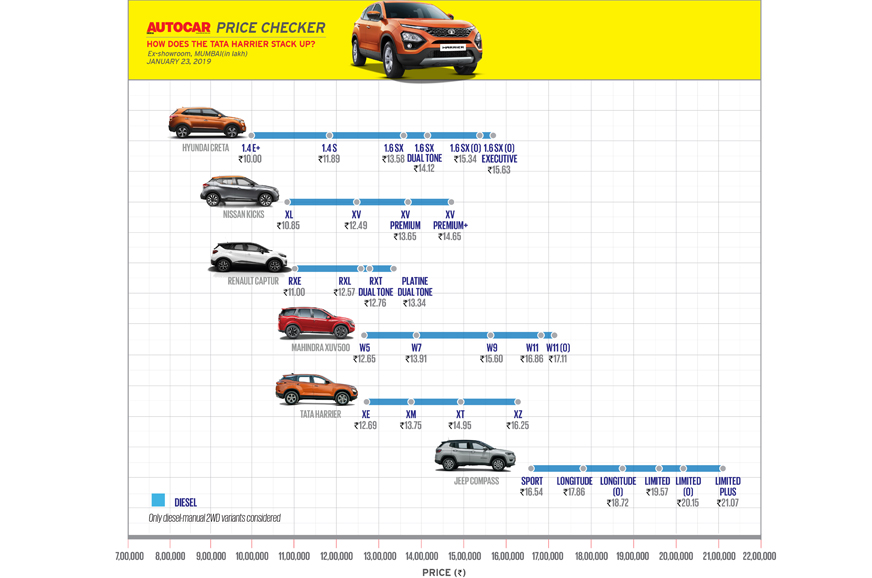 The Tata Harrier is easily one of the biggest and most important launches of 2019. And you have to hand it to Tata Motors for pricing the SUV very aggressively. Tata Harrier prices start at Rs 12.69 lakh and top off at Rs 16.25 lakh (ex-showroom, Mumbai). The SUV has been launched in a singly diesel engine-manual gearbox form only, and is available in four variants. Tata has been accepting bookings for the Harrier since October 2018, and sources claim the booking count had crossed 16,000 at the end of December 2018.