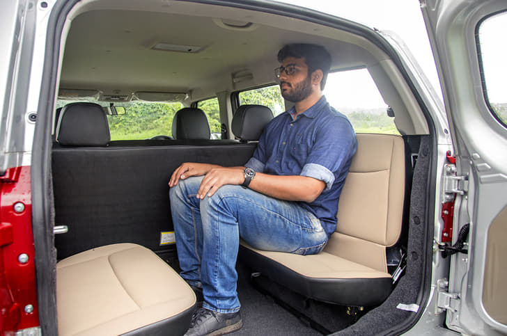 Use the door at the back to get into the rear seat and you can’t help but notice that the foot-step is placed quite high. This means access to this space will be difficult for shorter passengers and the elderly. Once inside, things don’t get much better. The space on offer is insufficient for adults, and as the seats face each other (jump seats), they don’t get any seat belts. Also Mahindra’s claim that four adults can sit in the rear must be taken with a pinch of salt. Yes, two average-sized adults can sit on one seat. But if they do, the seat opposite becomes redundant, as there’s just no knee room. And, like the middle row, there are no air con vents here, either.