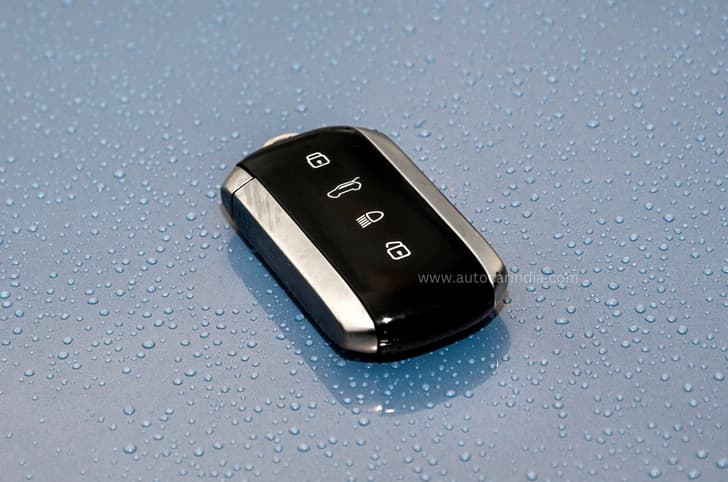 Just like the front, there’s a full-width LED light bar at the rear too, and a faux silver skid plate below the gloss black number plate housing. There is a roof-mounted spoiler element, a shark-fin antenna, and, like all coupe-SUVs, it lacks a rear washer/wiper. Further, the raked rear end also means that rear visibility isn't great from the inside. The Curvv EV is being offered in 5 paint shades and the “Virtual Sunrise” shade you see here looks fantastic in the metal. Tata has also debuted a new key fob with the Curvv EV, finished in gloss black and brushed aluminum, which looks and feels significantly more upmarket than the previous version.