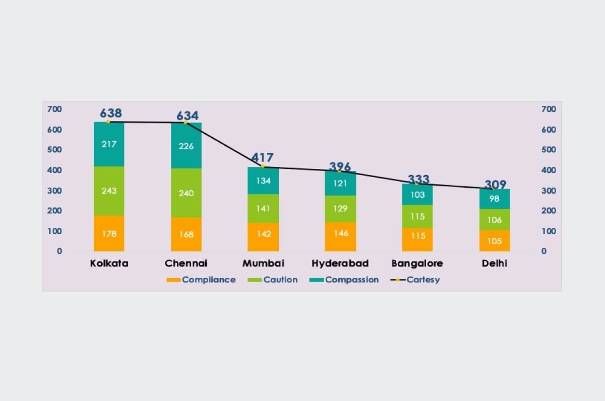 The study assessed people on compliance with regulations, the caution they exercised while driving and the compassion they showed for other commuters. Participants from each city were asked to rate their responses on a 10-point scale for a series of questions to find out if they had the propensity to talk on the phone while driving, overspeed, maintain an unsafe distance from other vehicles, not help accident victims and so on. An overall rating, or ‘Cartesy score’, was then calculated for each city, with a higher rating signifying a more favourable behaviour.