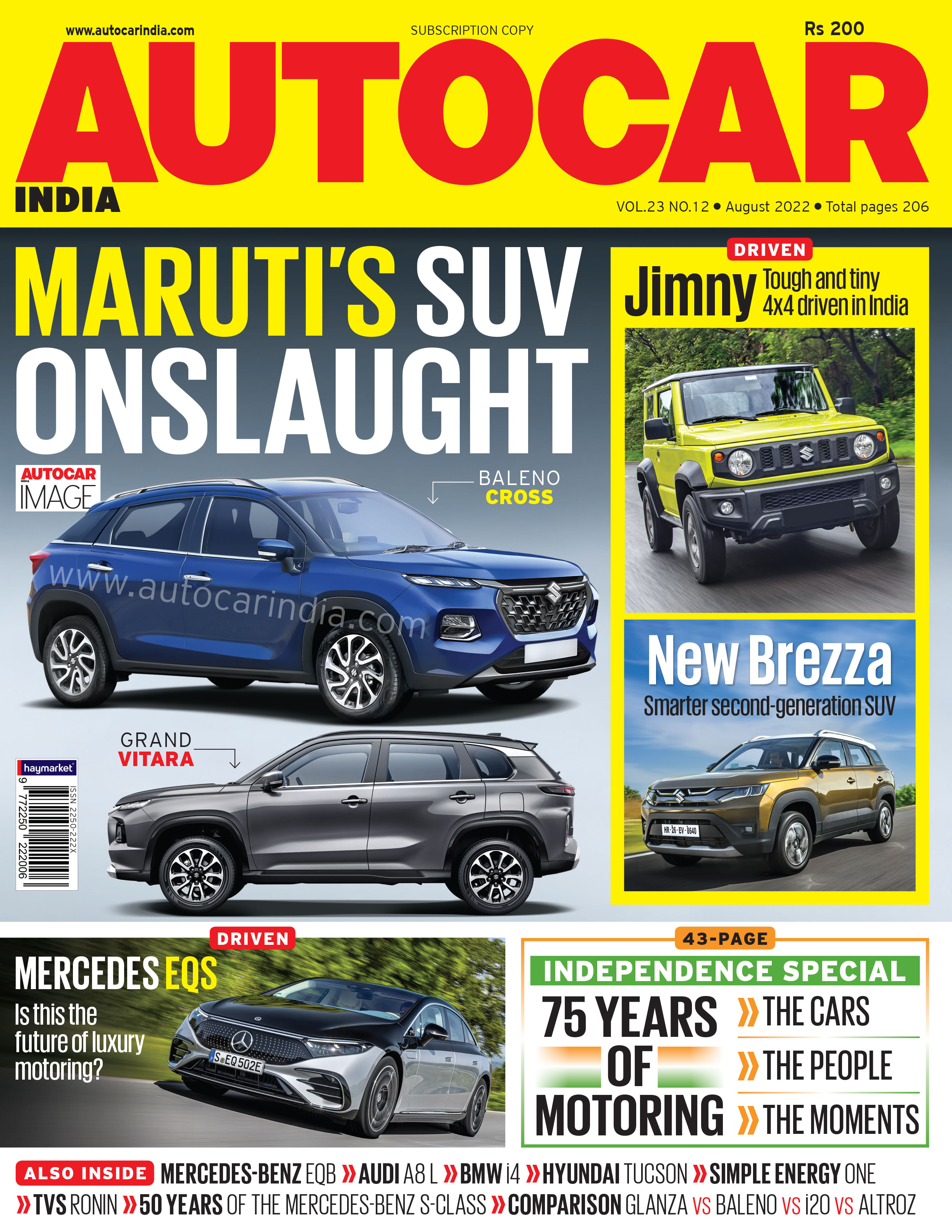 Buy Now!Maruti Suzuki’s SUV onslaught with the Baleno Cross and Grand Vitara headlines Autocar India’s August 2022 issue. This month, we also celebrate 75 years of Indian Independence with 43 pages of unmissable special features. We have first drives of the brand new Brezza, the BMW i4 and Audi A8. Plus, there’s drives of the Suzuki Jimny, the Mercedes-Benz EQS and the EQB. We’ve also reviewed the new Bajaj Pulsar 160 and TVS Ronin. Flip to our motorsport pages for a look-back on the career of racing champ Sebastien Vettel, who recently announced his retirement.