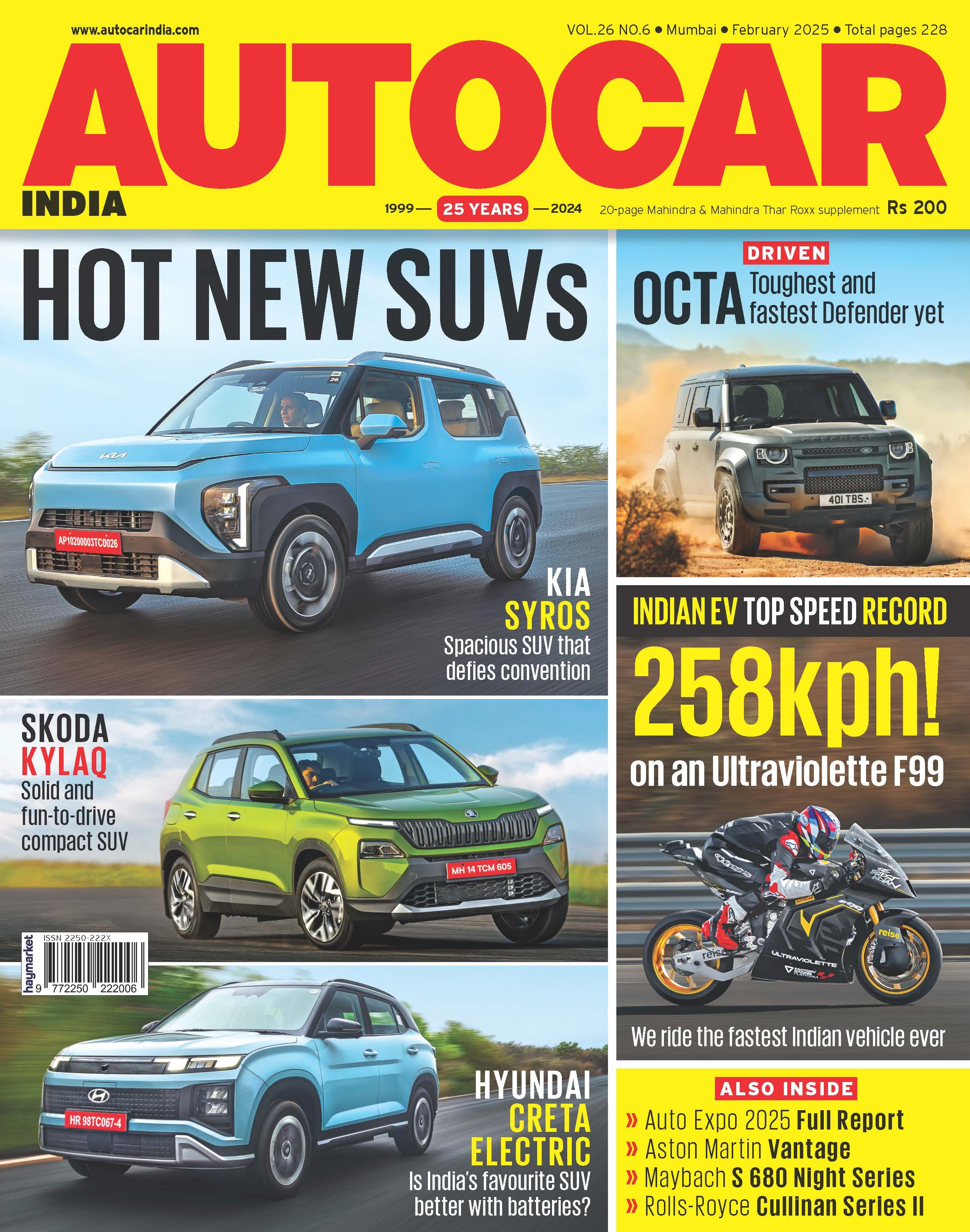 Buy Now!The February 2025 issue of Autocar India is headlined by our review of the new Kia Syros along with reviews of the Skoda Kylaq and Hyundai Creta Electric. We also have reviews of the Aston Martin Vantage and the Jawa 42 FJ in the bike section. Plus, there’s a comprehensive road test of the Kawasaki KLX230 and a report on the Dakar 2025.