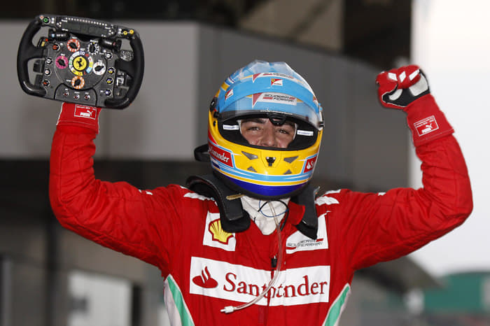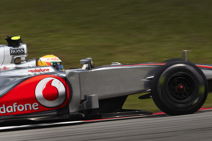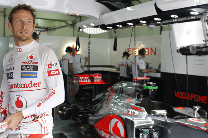 But while trying to fight back through the cars that had not pitted yet, Button slid into Karthikeyan's HRT and damaged his McLaren's front wing, forcing an extra pitstop.