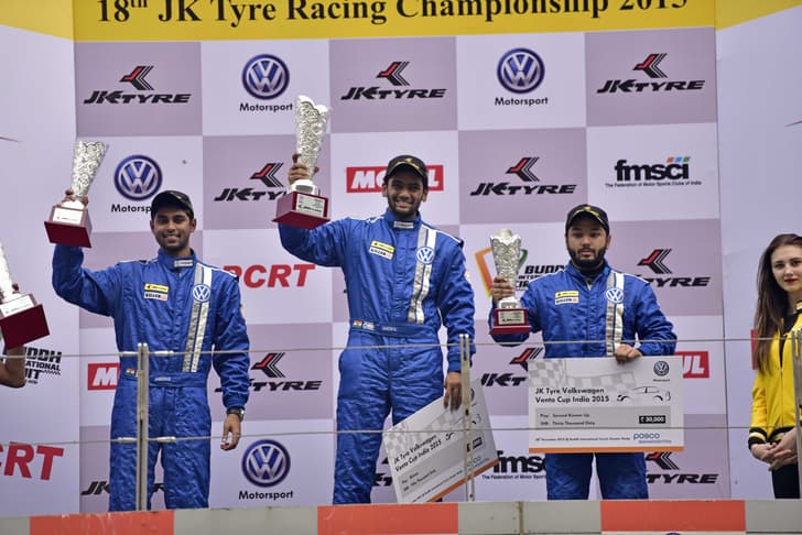 After what looked like an exciting eight lap run, Karminder, Sailesh and Ishaan in cars numbered 23, 19 and 17 respectively were the top three contenders to cross the chequered flag. As mentioned earlier, Sailesh was penalised for overtaking during a safety lap, while Karminder’s position was challenged by Ishaan and guest driver Dhruv Behl, as the feisty racer from Delhi, after being accused for nicking the challengers in his bid to clench the pole position, managed to hold onto number one for race two, albeit with a warning. Ishaan Dodhiwala and Anindith Reddy occupied position two and three on the podium respectively. The race also marked the fastest lap time around the Buddh circuit in the Vento Cup series, with Karminder lapping the 5.12 kilometre track in 2:26.664.