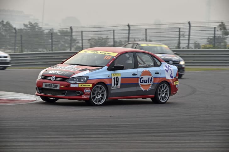 November 29, 2015: Race 2, round 4 at the Buddh International Circuit, race six of the 2015 Vento Cup, was a far cry from the straitlaced Race 1 that took place the day before. While the drivers managed to shave up to four seconds off of their round 3 times, thanks to the cold weather allowing the 180bhp Ventos go faster, besides their increasing familiarity with the circuit, the wintry smog remains an issue, to the point that the reverse gridded race grid got onto a rolling start with the safety car ahead due to poor visibility. For a change, the grid leader, this time, Prabhanj Paruchuri, managed to keep his lead till the fifth lap, before spinning out and crashing into the side wall just before the last corner. Despite the long held lead, trailing cars remained hot on Paruchuri’s heels, with reverse grid expert Karminder Singh sparing no time to climb up the grid. Having started at number six, Singh was number three by the third lap and clenched top spot when Paruchuri buckled during lap five.